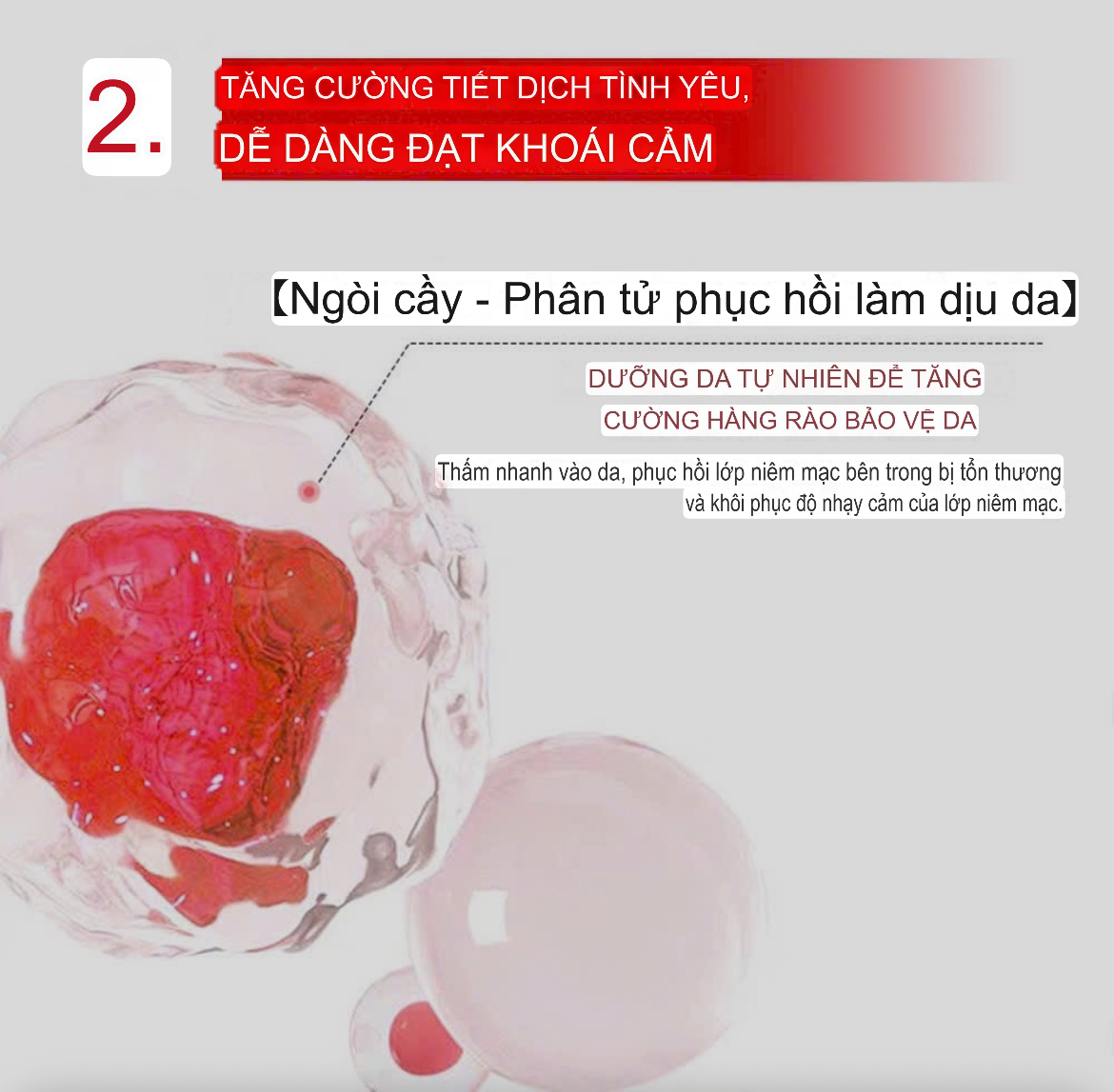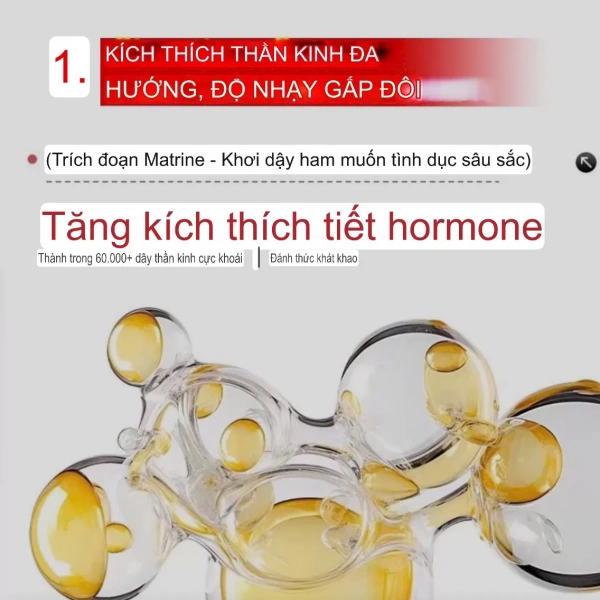 Sản phẩm giúp tăng cường và kích thích hormone lên cao để phục vụ cho nhu cầu kích dục của người dùng, thấm vào hơn 60.000 dây thần kinh cực khoái để đánh thức được dục vọng trong cơ thể đưa cuộc yêu lên cao trào hơn, kích thích hơn. Tăng độ nhạy cảm lên gấp đôi, nhà sản xuất muốn mang đến cảm giác thoải mái, kích thích và kì thú đến cho người dùng để từ từ tận hưởng những khoảng khắc thân mật bên cạnh người thương của mình. Mang đến không khí ấm cúng nhưng vô cùng sung sướng đến cho các chị em, giúp cho các anh thoải mái hơn trong việc phục vụ các chị em đến cực khoái.