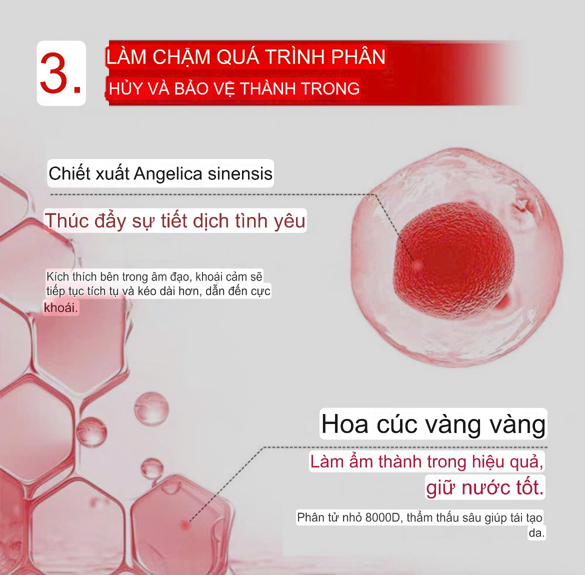 Bên trong thành phần sản phẩm có chiết xuất bởi mật của một loài hoa là Angelica sinensis giúp kháng viêm cho da cũng như kích thihcs bên trong tâm đạo, khoái cảm sẽ tiếp tục tích tụ và kéo dài hơn, dẫn đến cực khoái. Thúc đẩy sự tiết dịch để phục vụ cho cuộc yêu của các cặp đôi. Hoa cúc vàng sẽ làm ẩm bên trong tăng hiệu quả giữ nước tốt nhất. Phần tử nhỏ sẽ thấm sâu vào bên trong giúp tái tạo làn da.
