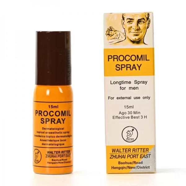 Giải pháp kéo dài thời gian cho quý ông từ chai xịt chống xuất tinh sớm Procomil Spray 15ml xuất xứ từ Đức chứa thành phần lidocaine nhưng hàm lượng cao hơn (1g) giúp gây tê tạm thời phần đầu dương vật giúp chống xuất tinh sớm, kéo dài cuộc yêu cực lâu cho chàng tự tin hơn.-